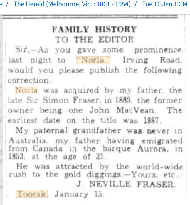The next surprise. In the midst of all of this research, I came across a reference on The University of Melbourne’s website to Sir Simon Fraser and Norla.