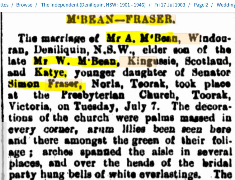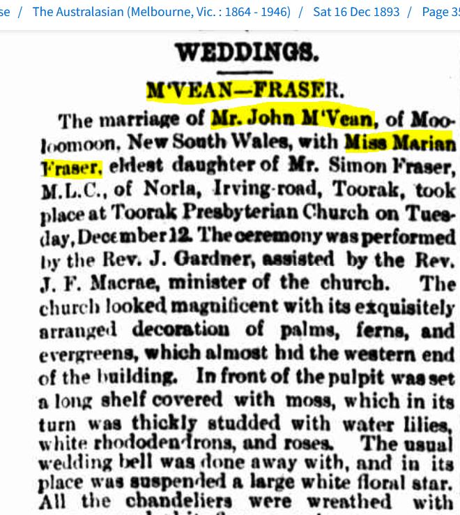 Wow! Even though I have had a copy of this article on the Were-Macvean wedding for ages, I hadn’t put any of this together. This is all new information for me, and a great surprise, especially after spending a couple of months researching Marion, John and Norla without so much as a hint of the connection coming up.