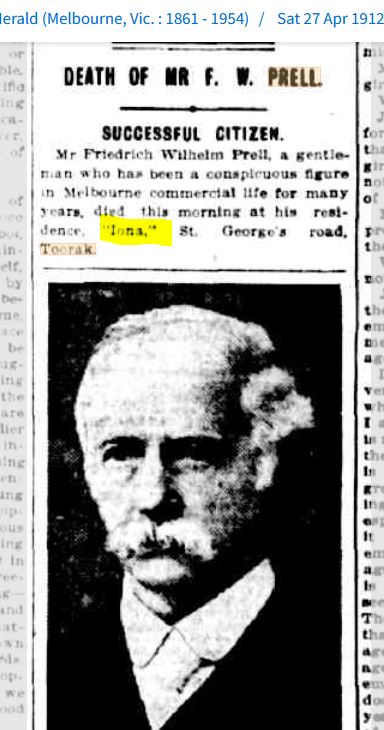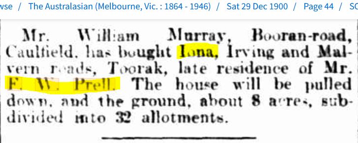 Mr & Mrs Prell had already purchased a house just a couple of streets away, called “Woonda” in St. George’s Rd, which they also renamed Iona.