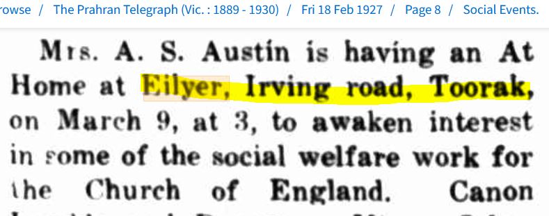 The Austins referred to here, I have worked out, were Mr Bertie Austin, or Albert Austin Jr, and his wife, Margaret, “Daisy” Austin née MacKenzie and their family. Bertie’s parents, Albert and Catherine Austin, owned “Eilyer” in Albert Road, Toorak, the house where they were sheltering. https://trove.nla.gov.au/newspaper/article/130036338?searchTerm=%22austin%22%22toorak%22