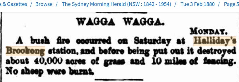 Now, back to the neighbours. You will note in (Article 2) above that Mr William Halliday is noted as being from “Brookong”. It was the name of the sheep and cattle station he owned in the Wagga Wagga area of New South Wales.