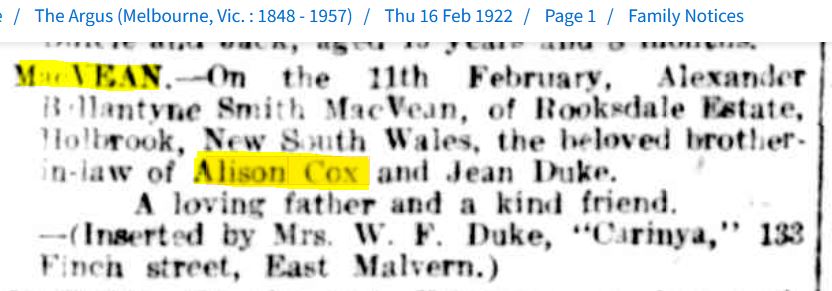 Alison next appears in my great-grandfather, Alexander Ballantyne Smith Macvean’s death notice.