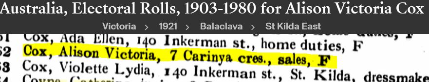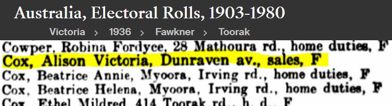 Because there has been no listing since 1937 we can’t be sure when Alison actually made the move to Sydney.
