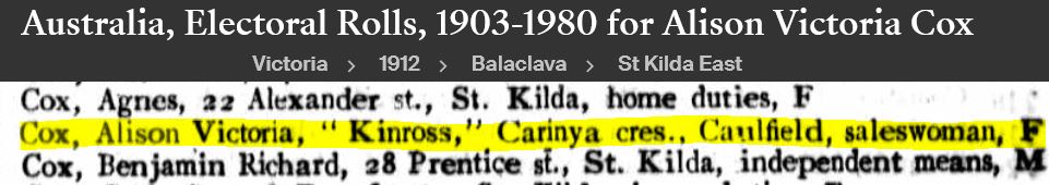 We can’t move on without noting that Alison was working as a “saleswoman” at this time. This is 1912, just ten years since the new Commonwealth gave white women the right to vote and a time when women were moving out of their traditional working roles of domestic service and farming and moving into factory, shops and office work. https://www.nma.gov.au/audio/glorious-days-australia-1913/transcripts/women-in-white-australia