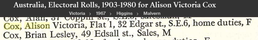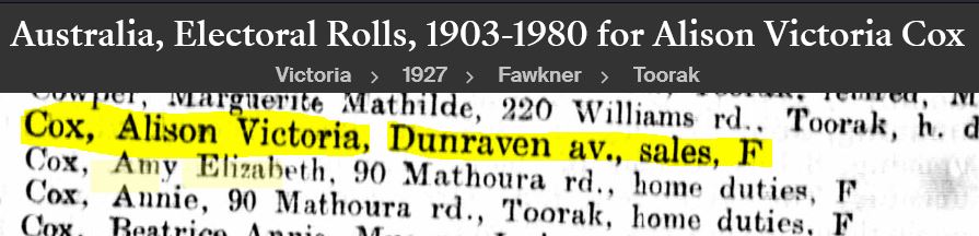 Alison is virtually non-existent online. She only comes into view through the death notices of her family, a few Electoral Roll listings and some amazing recollections very generously shared by a cousin, Alec D.