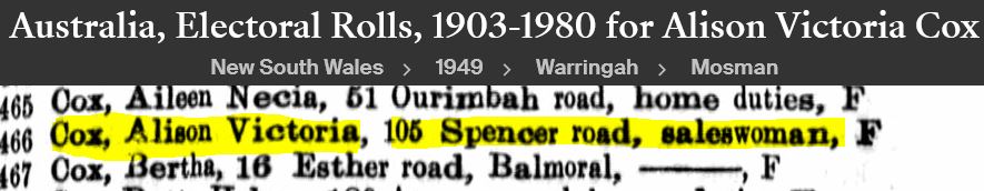 The Sydney move must have worked out for Alison as she was still there in 1954.