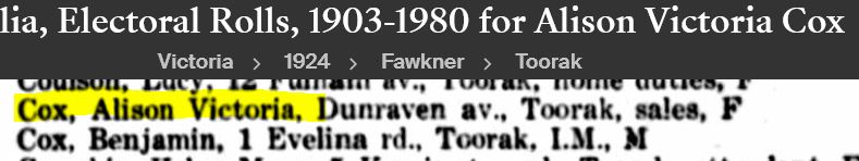 Now I know I’m making a big assumption here but I think all the Cox sister’s might have been very close. This Electoral Roll listing below shows where Jean and Walter or Wally as he was known were living in 1924.