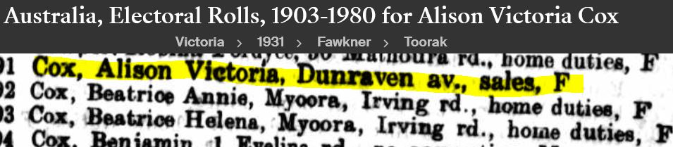 This fits with what Alec recalled, he was told, that when Alison retired from her job with David Jones in Sydney she moved into “…the large house in Melbourne with Tina.“