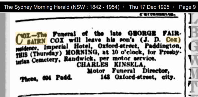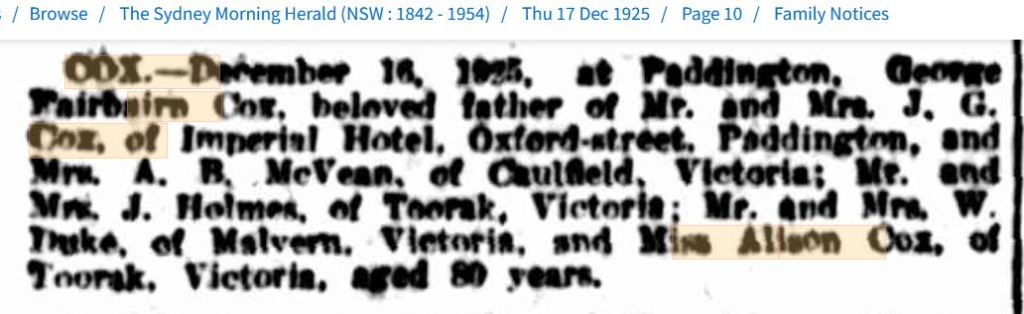 The next mention of Alison is in the death notice of her father, George Fairbairn Cox. My 2x great-grandfather.
