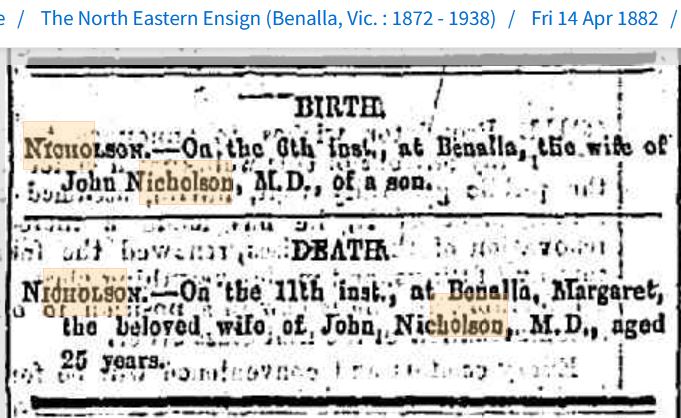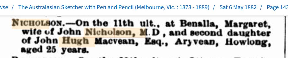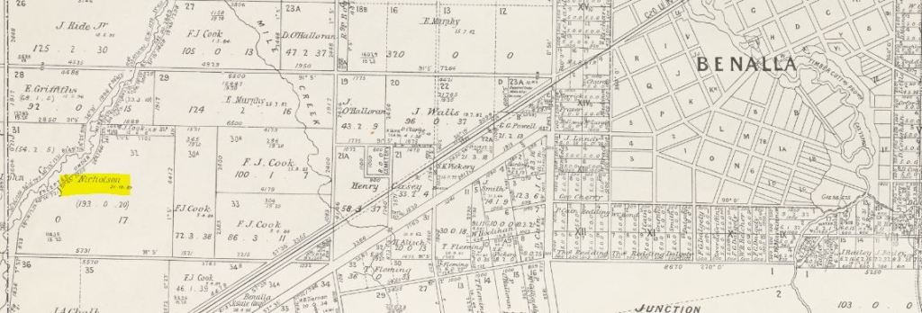 Another link to the property has just revealed itself. It too is from that forgotten treasure trove I had. Specifically, it was resources shared with me by my cousin, something times removed, Sally, over ten years ago. I have mentioned this treasure trove many times before. In it, I found some information from a descendant of John Nicholson and his third wife, Frances Coster, a Peter McNab. The link? specifically some information from John’s will, which was printed in a document created by the Benalla Historical Society.