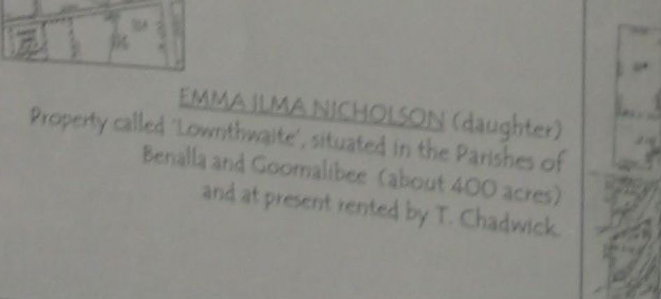 It shows, that Emma, one of John’s daughters is bequeathed a property called Lownthwaite in Benalla. Emma is John and his third wife, Frances Coster’s youngest daughter. She is Richard’s step-sister. He was twelve years of age when she was born in 1894.