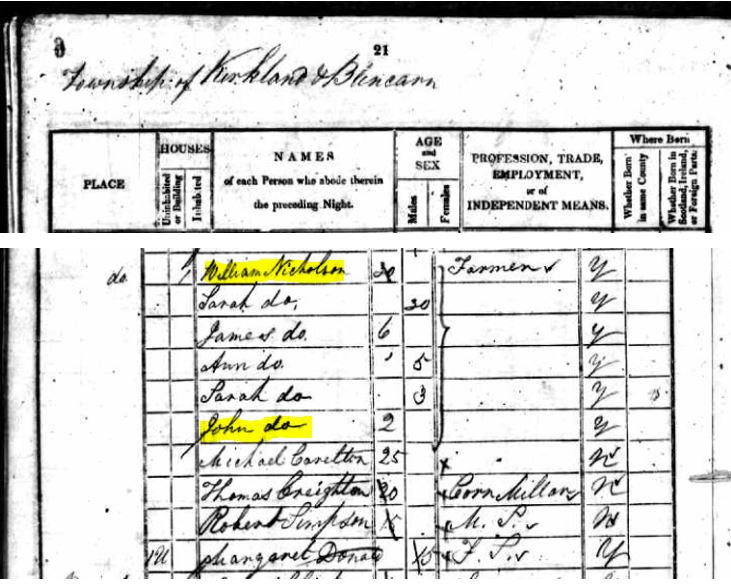 Below is a copy of the 1841 Census for the family, you’ll notice that it doesn’t have a specific address for where the family lived just a notation of the township of Kirkland and Blencarn and stating that William is a farmer. Exact addresses became a requirement for the next Census in 1851, but if the household was rural, the only information given might again be just a village or parish name. https://www.nationalarchives.gov.uk/help-with-your-research/research-guides/census-records/