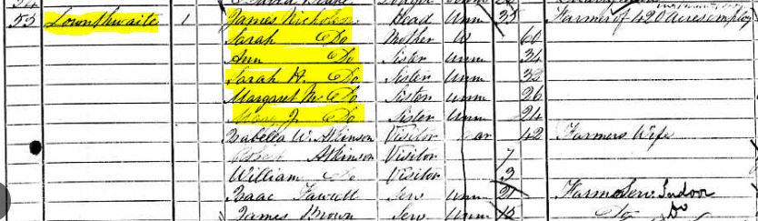 Anne Nicholson is John’s (don’t forget, he is Richard’s father) elder sister, and she never married. Census records show that she was born, raised, and lived on the family farm in Lownthwaite for almost 40 years.