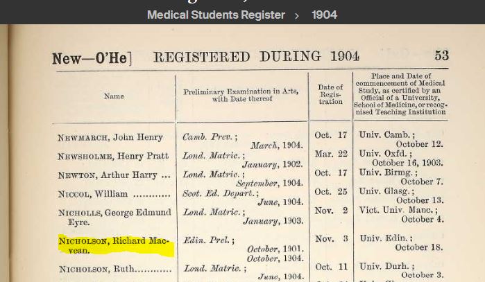 Richard’s father was Dr John Nicholson MB. (Medicinae Baccalaureus)https://www.cpsbc.ca/public/registrant-directory/credentials