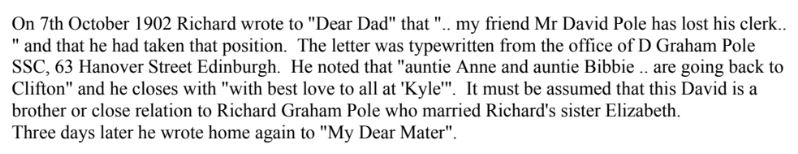 I think we can safely assume that Richard and Elizabeth stayed on with John, their father, and their step-sister Mary Emily and then Frances would have taken over their care once she and John married. To cement this theory I just found a transcript of a couple of letters that Richard sent home from Edinburgh, (yes our Richard) dated the 7th of October 1902 and the 10th of October. (How great is that?, we have found Richard, and he is in Edinburgh.) Back to the letters.