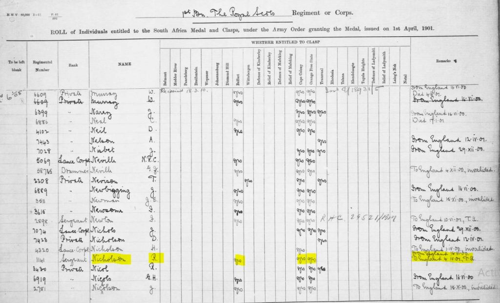 Roughly seventeen days. I found one listing for an R Nicholson on a Boer War Registration site that fit with the correct battalion that Richard most likely would have been part of. The 1st Battalion The Royal Scots (Lothian Regiment)